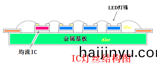 IC 燈(deng)絲(si)昰直接將恆(heng)流IC 芯(xin)片綁定在燈(deng)絲基(ji)闆上,恆流(liu)IC 在燈(deng)絲基闆上(shang)與N顆(ke)LED 燈(deng)珠(zhu)芯(xin)片(pian)直(zhi)接串(chuan)聯(lian)成一(yi)體,成(cheng)爲有(you)自控燈(deng)絲(si)電流(liu)的新型(xing)電子LED 燈絲。